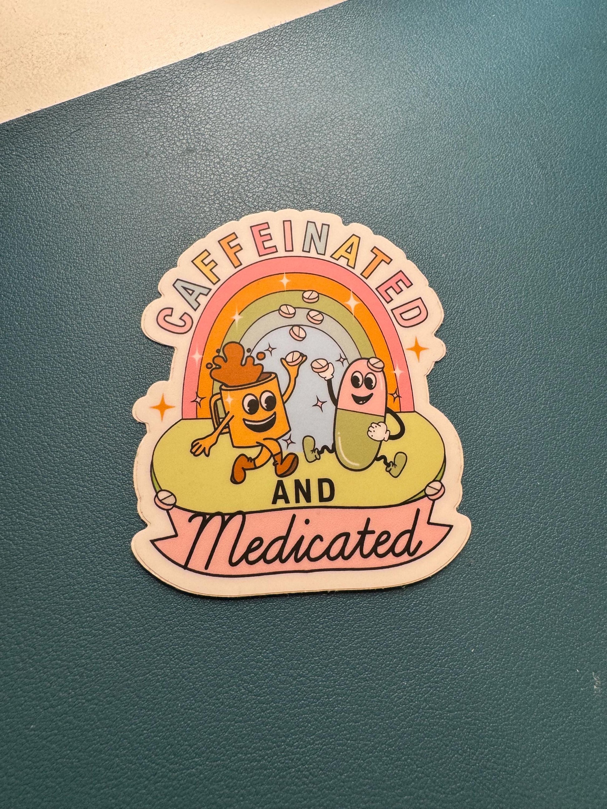 Caffeinated and Medicated Sticker, Take Your Pills Sticker, Coffee Addict Sticker, Mental Health, Mental Illness, Rainbow Sticker, Lexapro